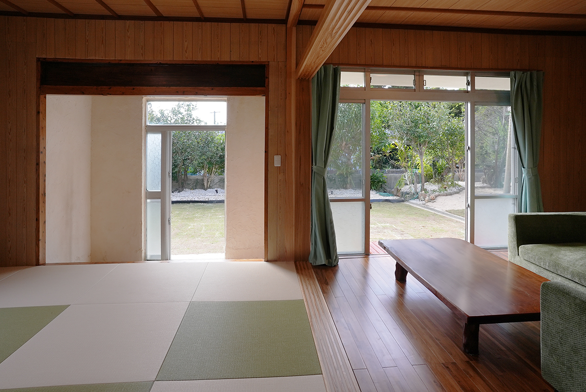 和室、リビング、台所、寝室、浴室、ダイニングスペース、ガレージ(2台)