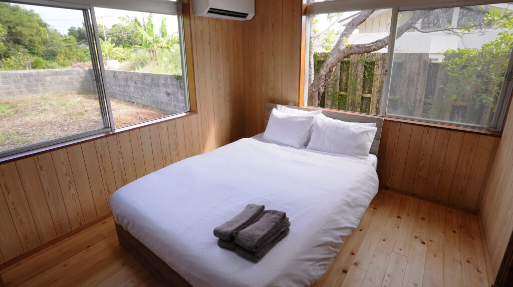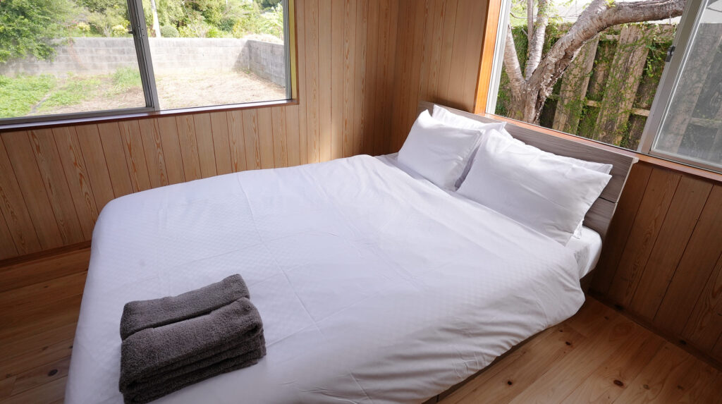 ダブルベッド設置、床はフローリングで夜は、落ち着いた空間となります。