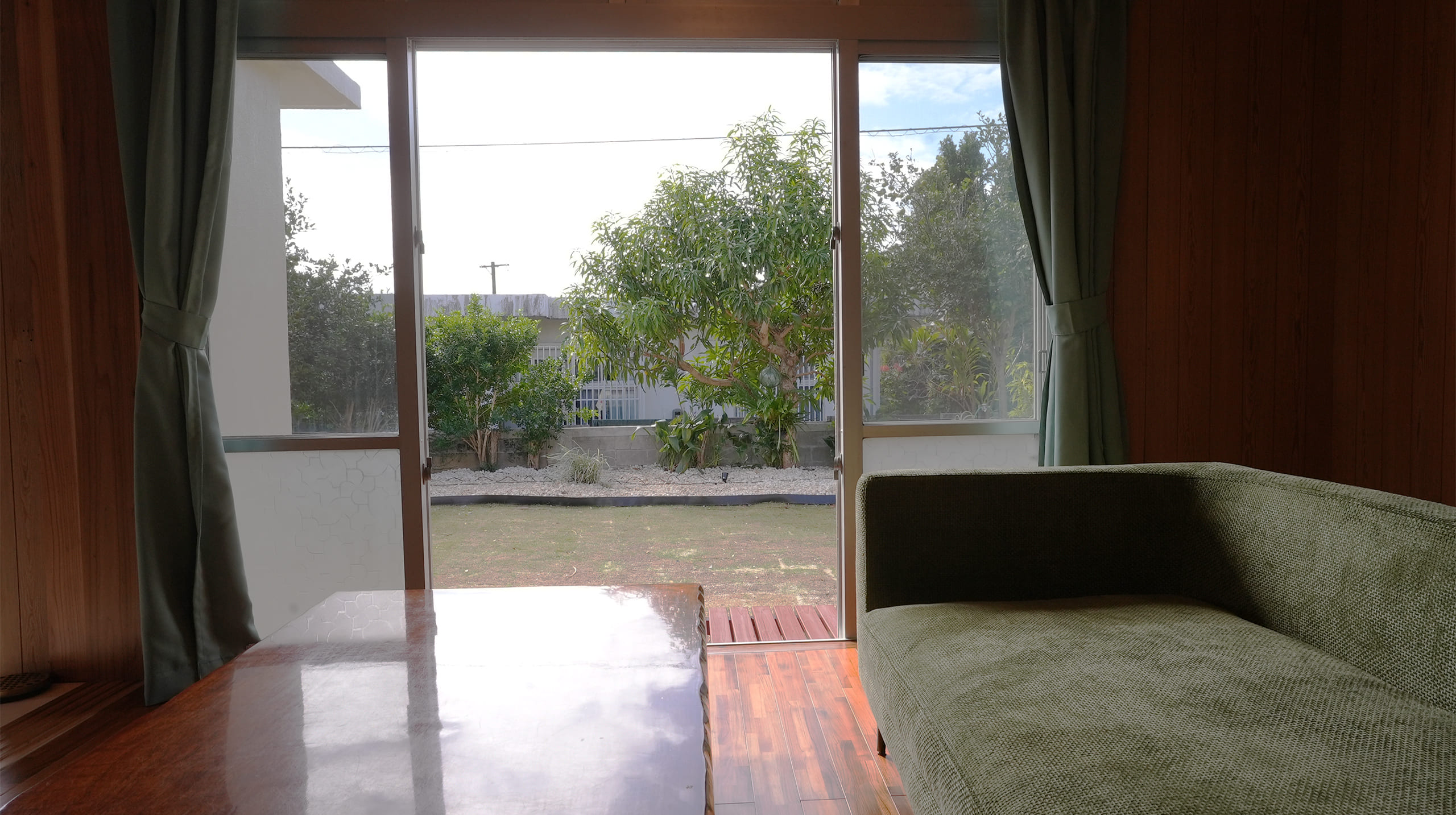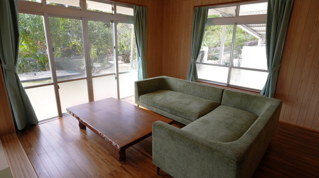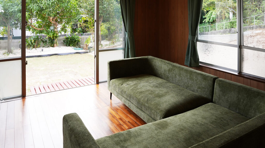 緑の大きなL字型ソファからは、庭園を眺める寛ぎのスペース。