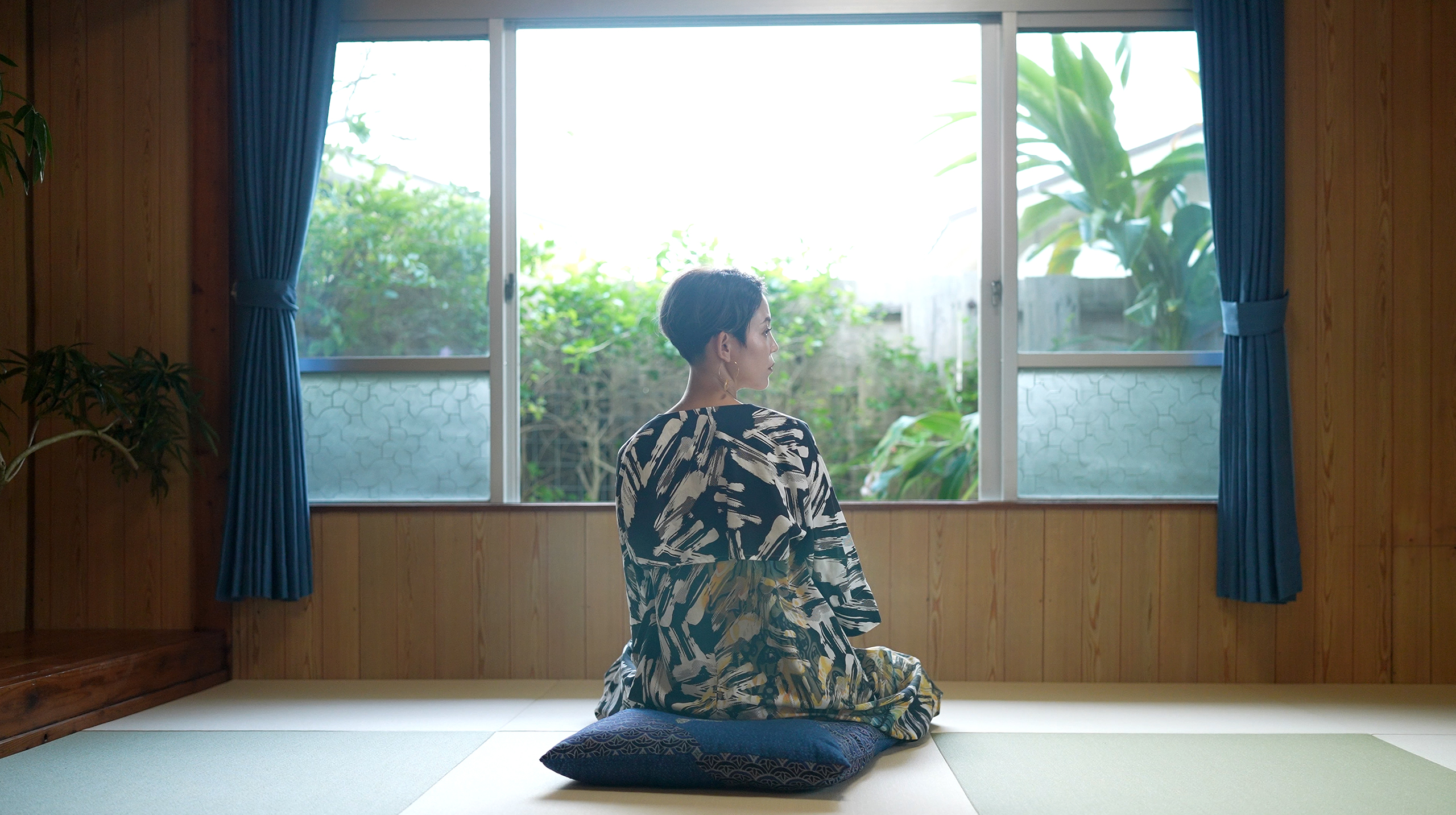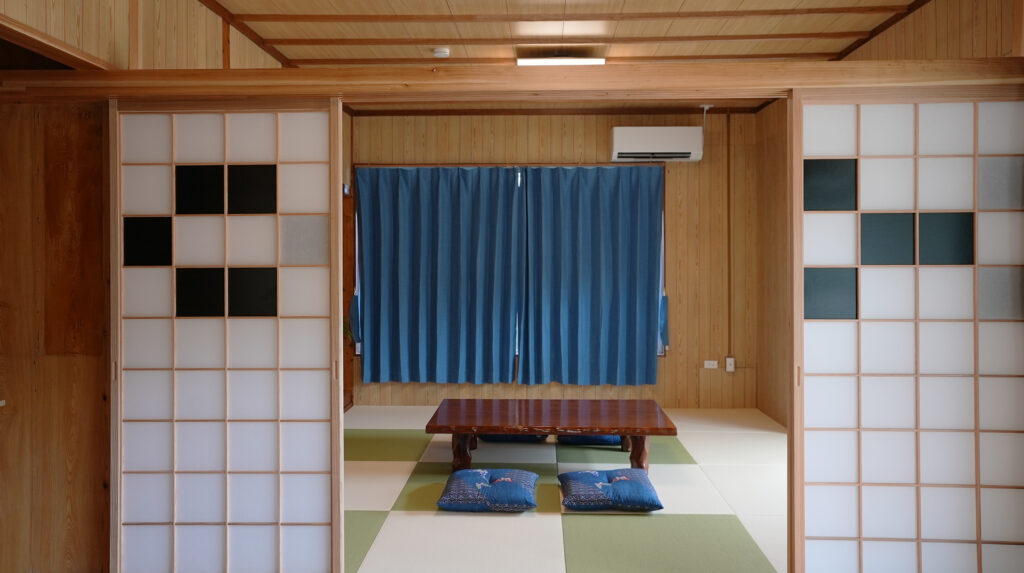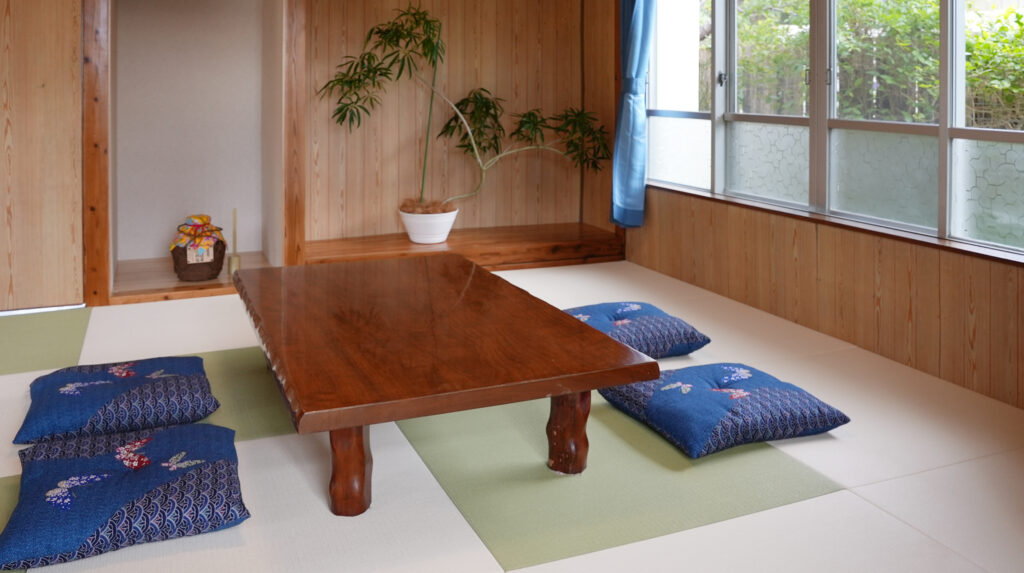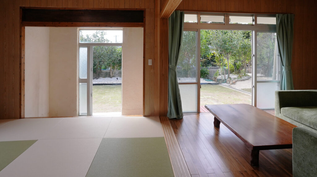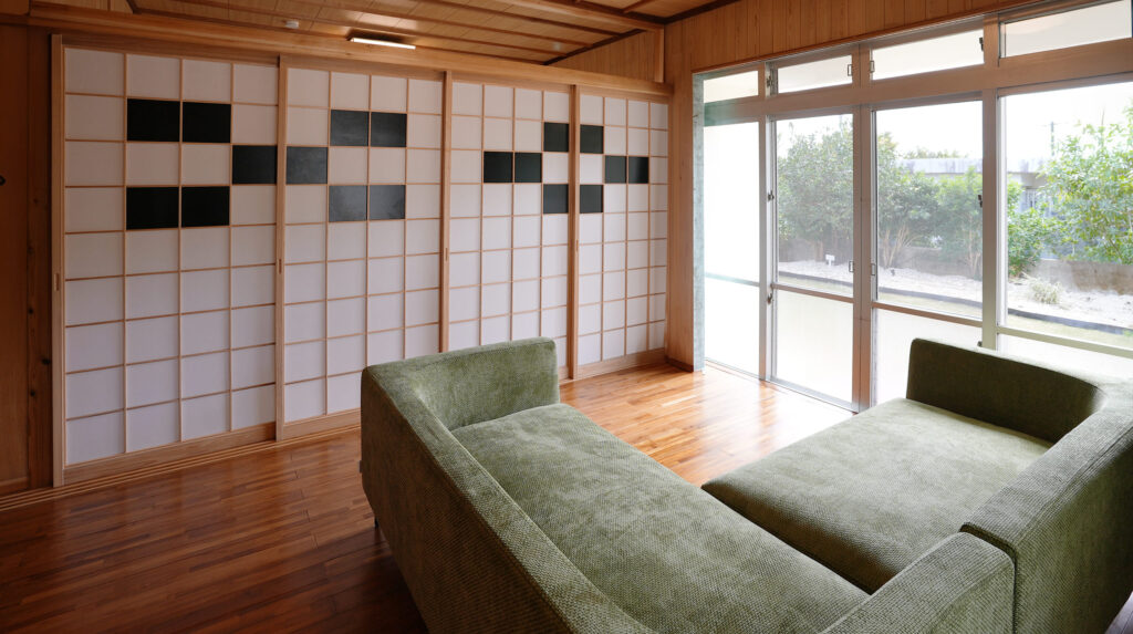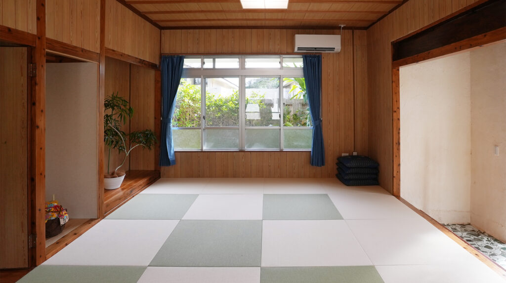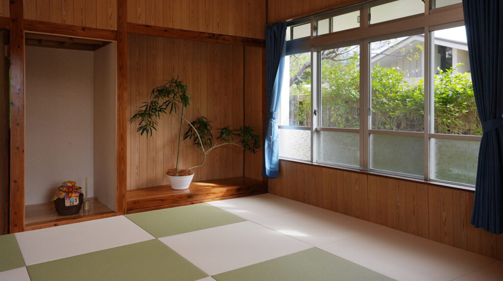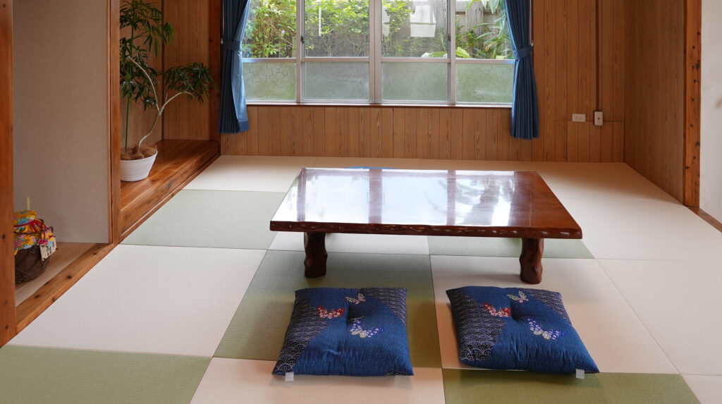 ミンサー柄の配置でコーディネートした琉球畳は、癒しの広々とした寛ぎの空間。