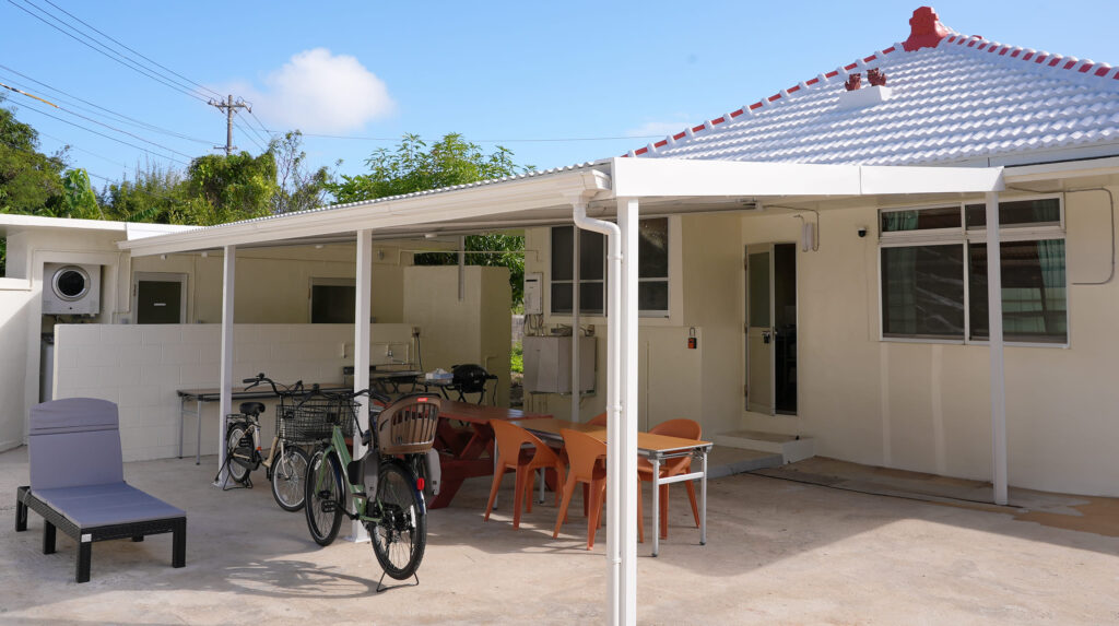 ガレージには、アウトドアテーブル(8人掛け)、